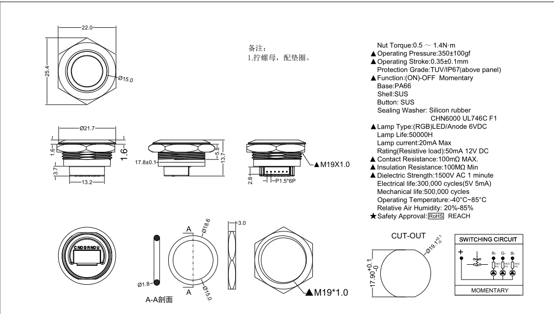 | 產品名稱: | 19mm輕觸式金屬按鍵開關 |