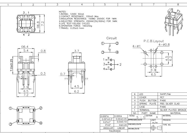 接觸電阻:50mΩ(max)絕緣電阻:100MΩ(min)