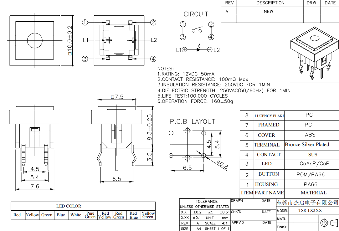接觸電阻:50mΩ(max)絕緣電阻:100MΩ(min)
