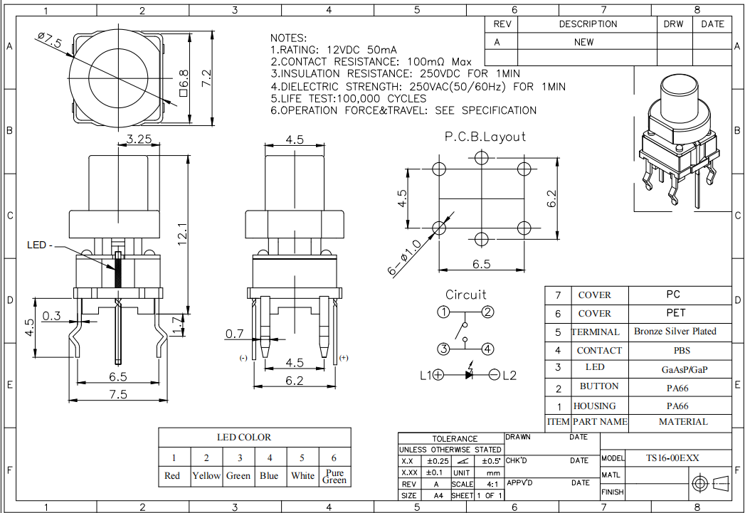 接觸電阻:50mΩ(max)絕緣電阻:100MΩ(min)